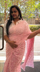 To drape the saree, start by pleating the fabric at the waist and wrap it around yourself, securing it with pleats and a pallu (drape) over the shoulder. To care for the saree, dry clean it to preserve the delicate embroidery and fabric quality.
