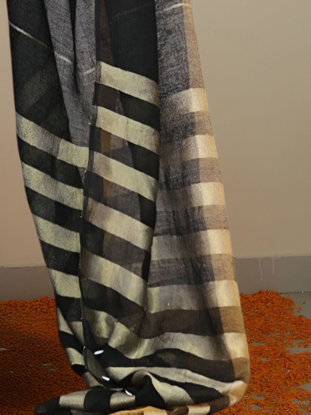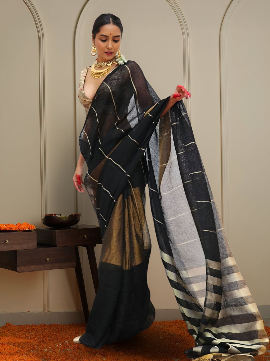 Exquisite pure linen saree adorned with elegant zari work, offering a perfect blend of comfort and luxury. Ideal for festive occasions, celebrations, and sophisticated everyday wear with timeless appeal.
