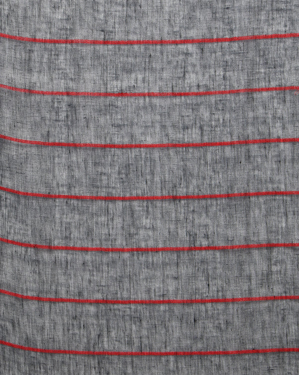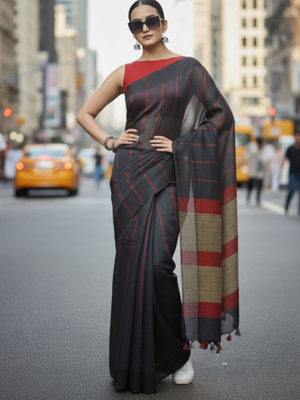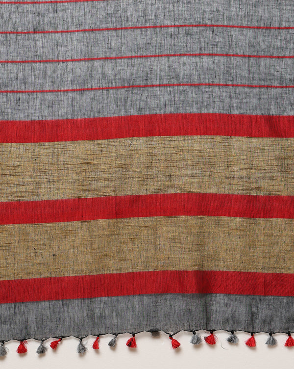 Bold Handwoven Pure Linen Gray Saree Striped Design