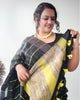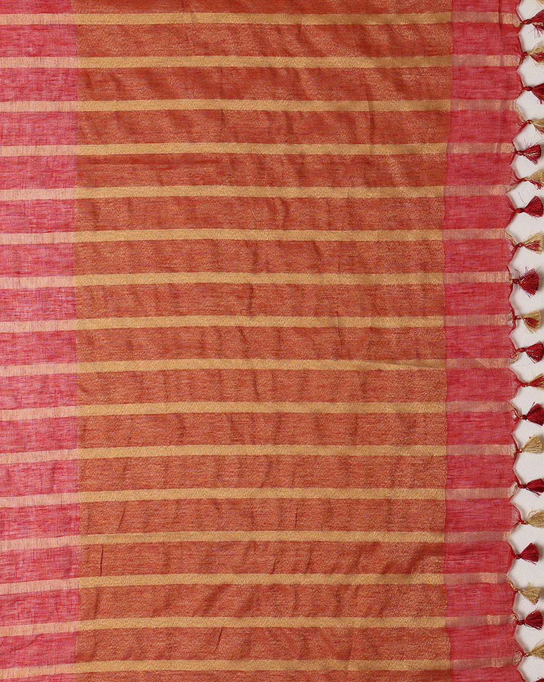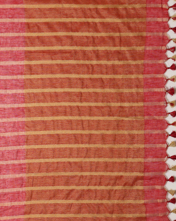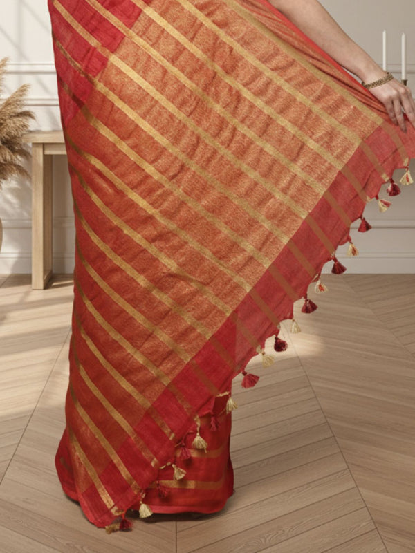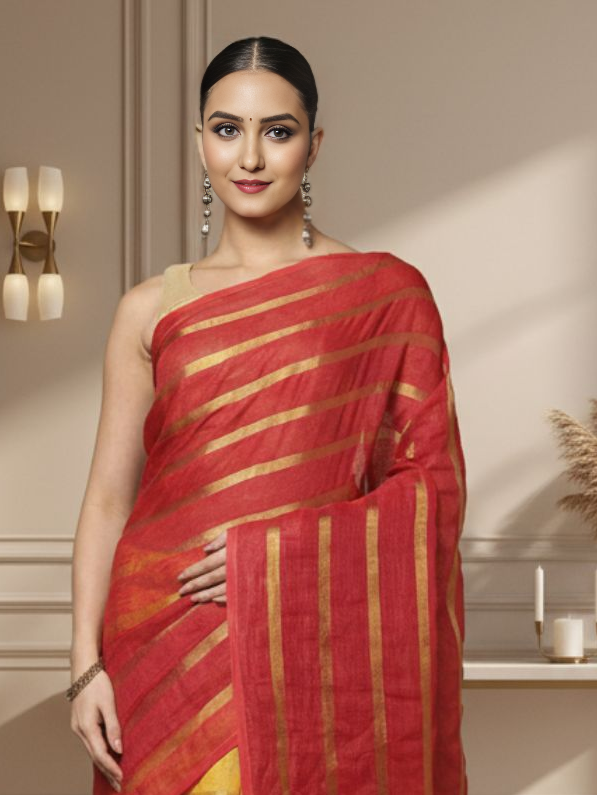 Pure linen hand-dyed striped saree, blending timeless elegance with modern artistry. Soft, breathable, and effortlessly graceful, this handcrafted drape is perfect for festive occasions, office wear, or casual styling.