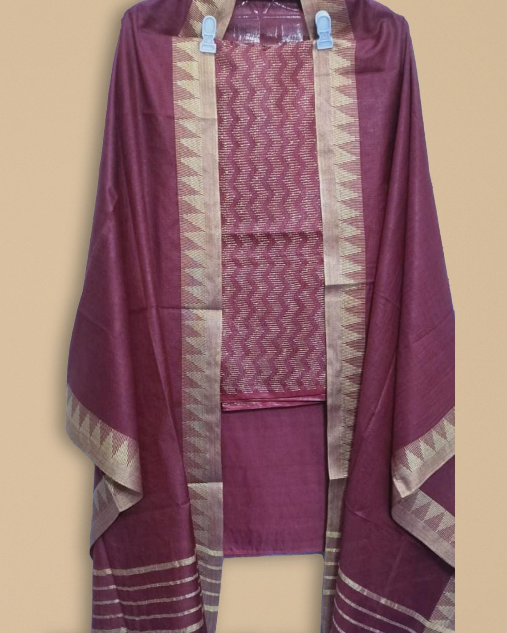 Elevate your ensemble with our Handcrafted Katan Silk Self Weaving Suit. Featuring self-weaving patterns on fine Katan silk fabric, each suit exudes elegance and sophistication, perfect for special events and celebrations.