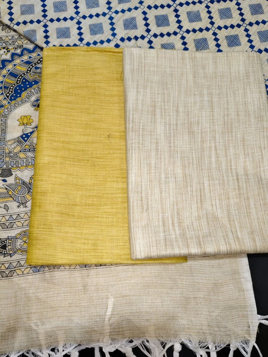 A Khadi Cotton Madhubani Print Suit is a handcrafted ethnic outfit made from handspun, handwoven khadi cotton and decorated with the traditional Madhubani (Mithila) artinspired prints. It blends comfort with cultural heritage, making it ideal for everyday wear as well as festive occasions.