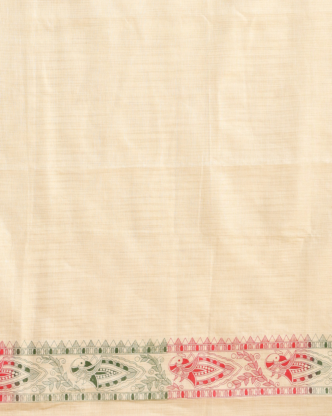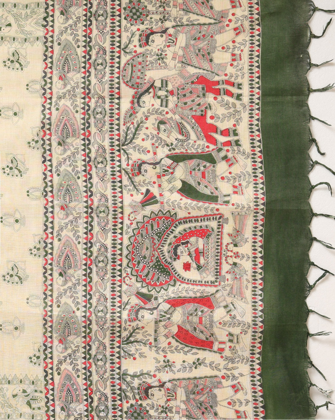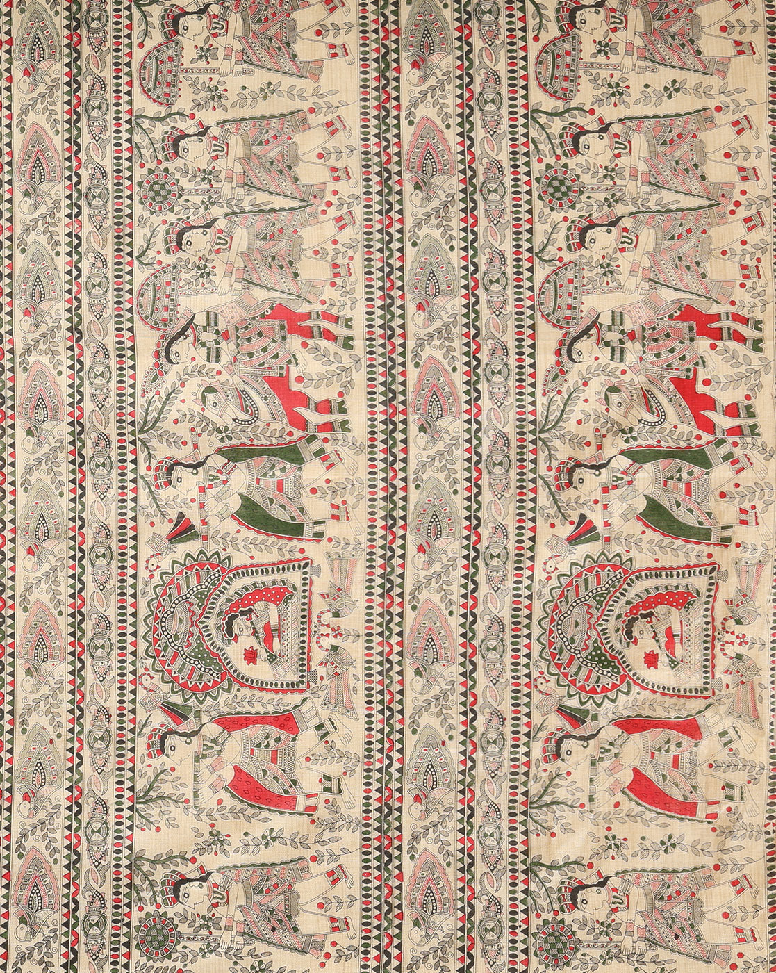 Madhubani handblock print combines the intricate motifs of Madhubani art with the traditional block printing technique. Artisans carve wooden blocks with Madhubani-inspired designs, which are then used to print patterns onto fabric. This process results in vibrant and detailed textiles, often depicting scenes from nature, mythology, or everyday life, with a unique cultural charm.