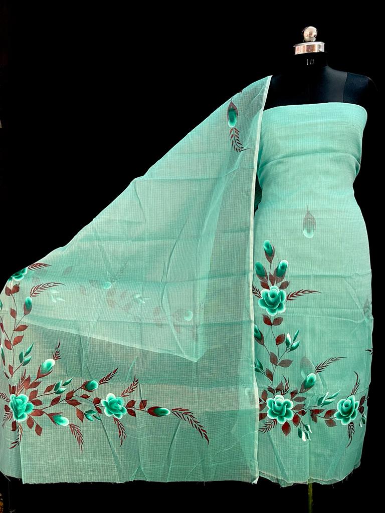 The Kota Doria Hand Painted Suit Material set includes unstitched fabric for a kameez (top) and bottom (salwar or pants), along with a matching dupatta (scarf). This allows you to customize and stitch the outfit as per your preference.