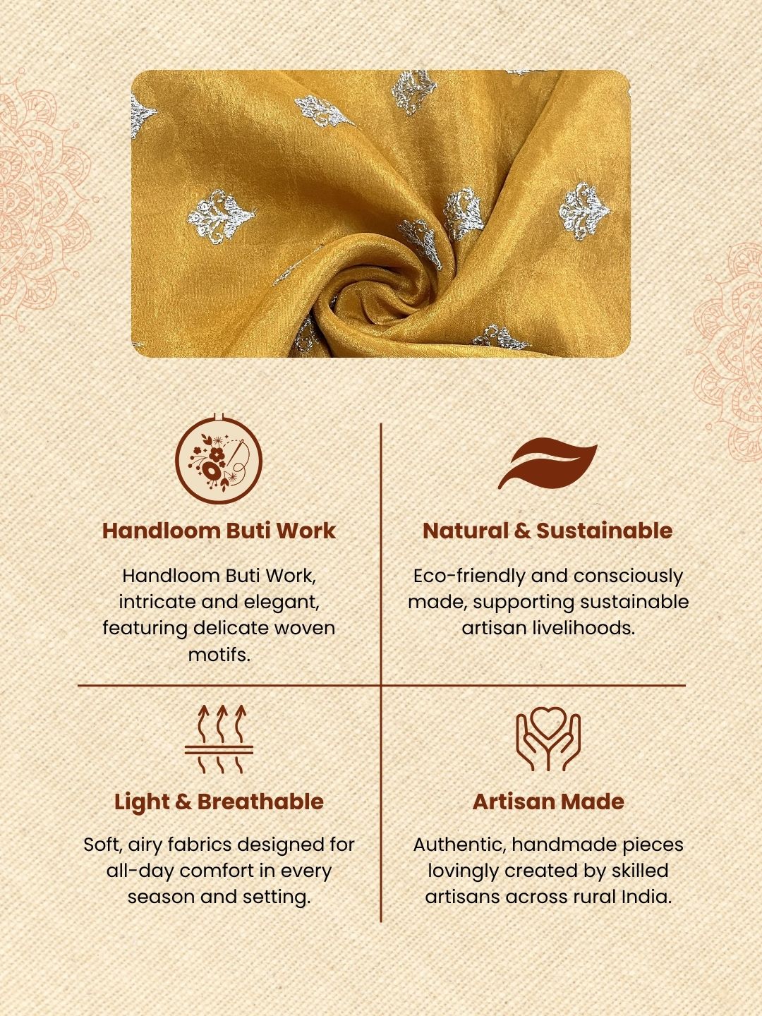 **Handloom Buti Work** refers to a traditional weaving technique where small, intricate motifs called *butis* are handwoven into the fabric using a handloom. Each buti is created with precision using threads of silk, cotton, or zari, resulting in elegant patterns that add depth, texture, and cultural richness to the textile.