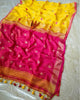 - The jacquard pattern on this saree is meticulously woven using a special loom called a jacquard loom. This loom enables the weaver to control each warp thread individually, resulting in elaborate designs and motifs with raised textures.