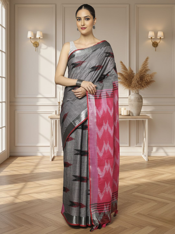 Elevate your style with our Handcrafted Slub Linen Ikkat Saree. Featuring traditional Ikkat patterns on soft slub linen fabric, each saree exudes elegance and charm, perfect for adding a touch of ethnic flair to your ensemble.