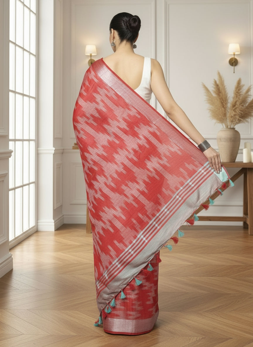 Elevate your style with our Handcrafted Slub Linen Ikkat Saree. Featuring traditional Ikkat patterns on soft slub linen fabric, each saree exudes elegance and charm, perfect for adding a touch of ethnic flair to your ensemble.