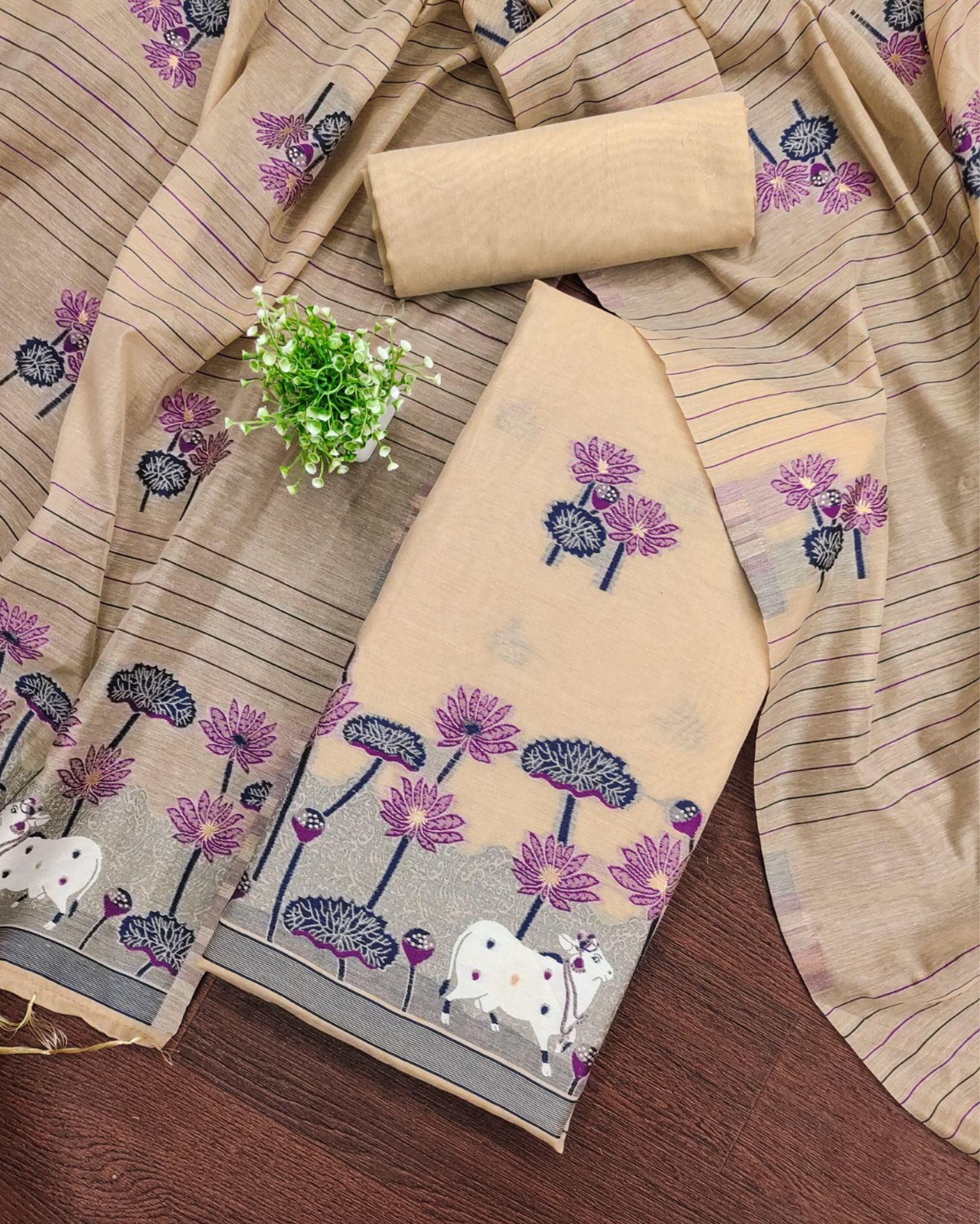 Elevate your ethnic wardrobe with our Banarasi Cotton Suit featuring exquisite brocade weaving, blending timeless tradition with contemporary elegance. Perfect for festive occasions, celebrations, and graceful everyday wear.