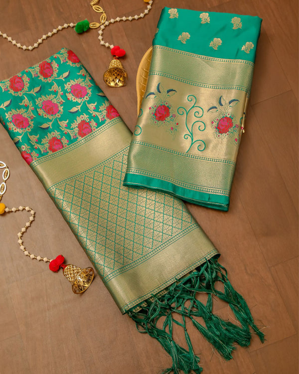 Noor-e-Banaras Brocade Weaving Lichi Silk Suit Teal Green