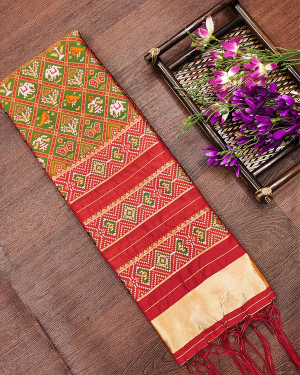 Add regal charm to your ethnic look with our Banarasi Lichi Silk Dupatta featuring intricate Patola weaving. Luxuriously soft, vibrant, and traditional—perfect for weddings, festivals, or special occasions.