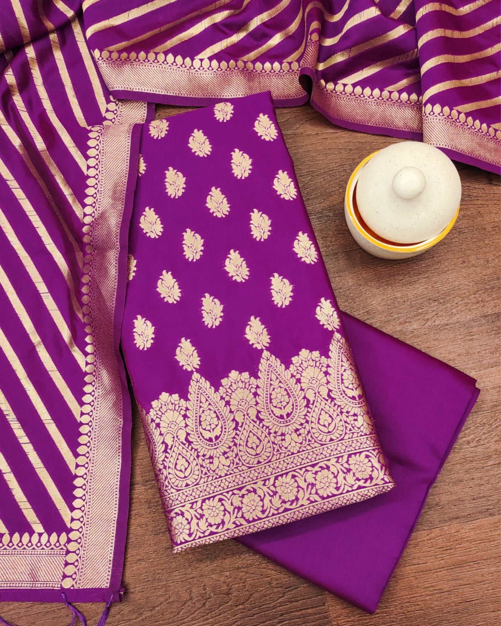 Elevate your ethnic charm with our Banarasi Lichi Silk Suit featuring exquisite brocade weaving. ... Read more