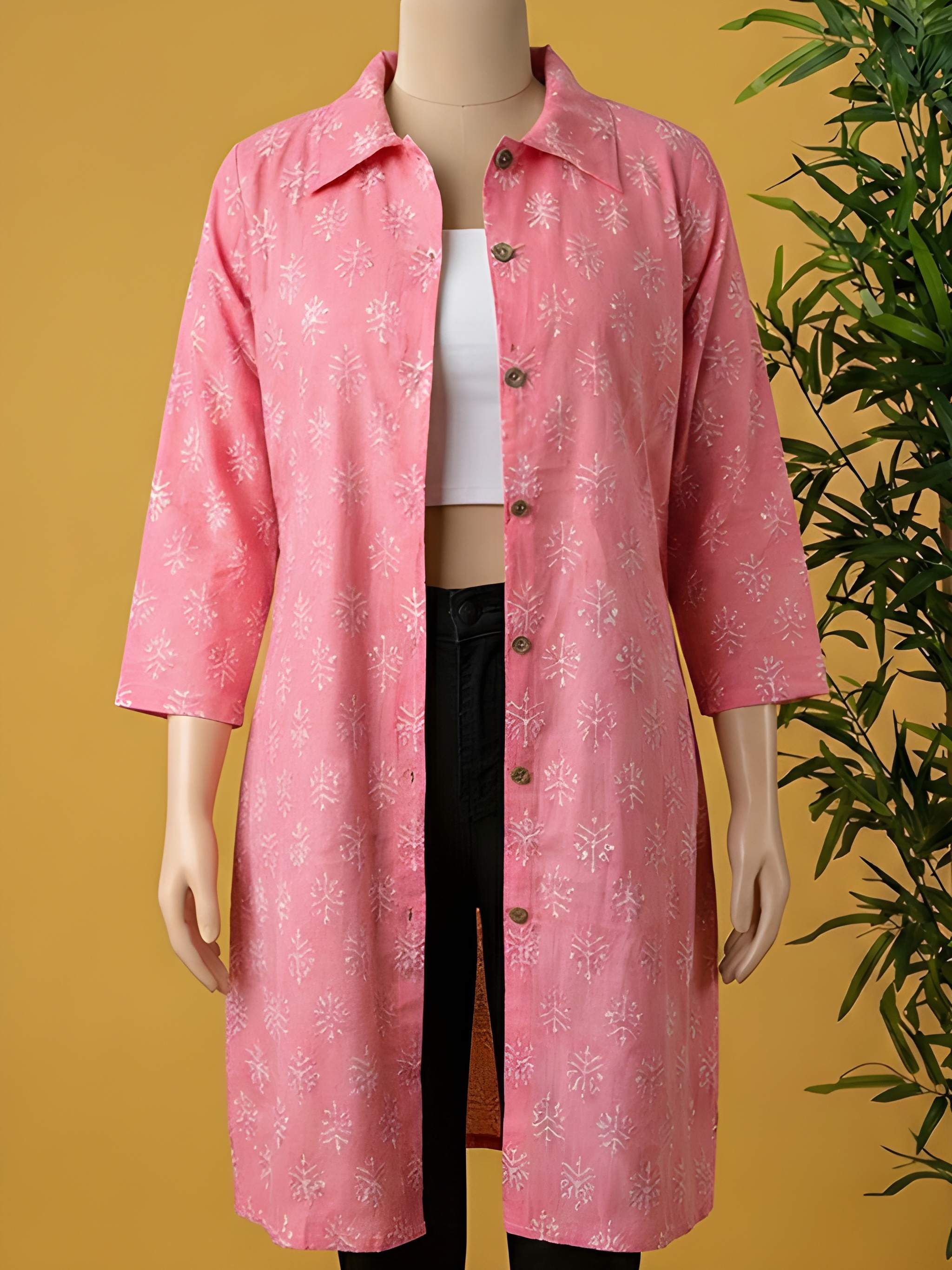 A Pure Cotton Hand Block Print Jacket is a handcrafted outerwear piece made from pure cotton fabric. Artisans decorate the fabric using traditional hand block printing. You can layer it over kurtas, dresses, tops, or sarees.