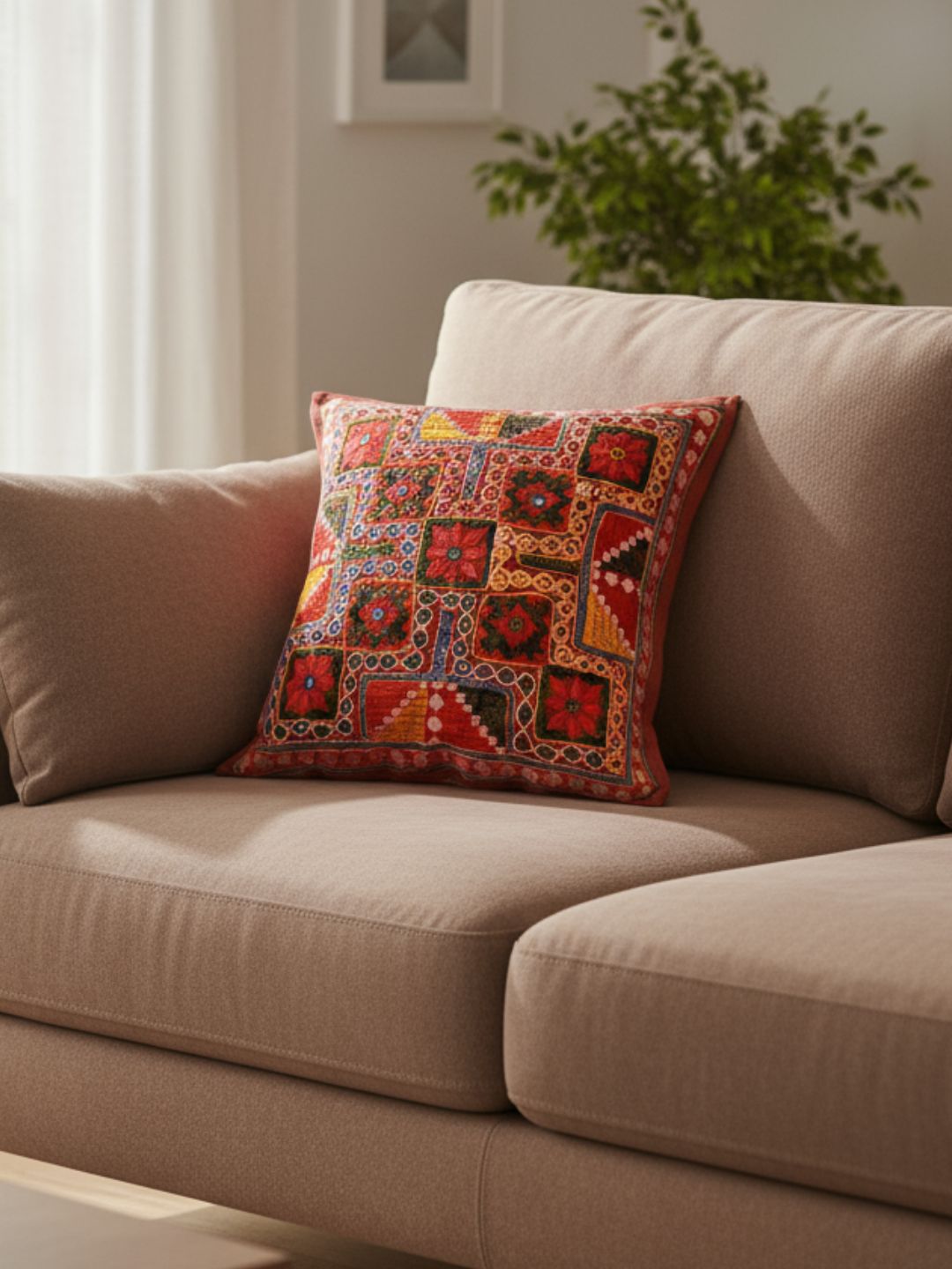 Hand Embroidered Cotton Multicolor Mirror Cushion Cover, showcasing vibrant artistry with intricate mirror work. Crafted from premium cotton, it adds charm, tradition, and elegance to your living space. Perfect for décor and gifting.
