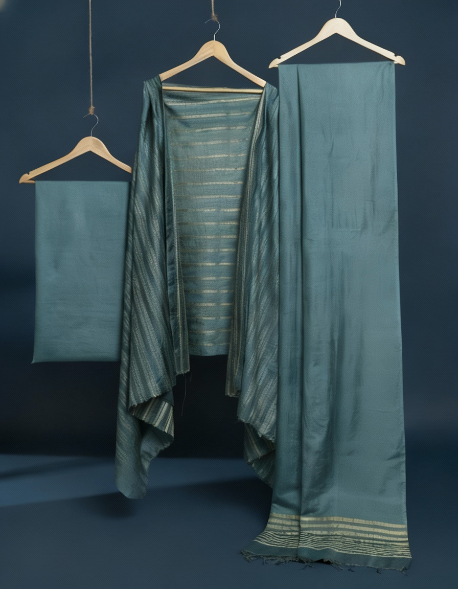 A Katan Silk Suit Piece is handcrafted with intricate weaving techniques using pure silk threads. Each piece showcases meticulous craftsmanship and exquisite designs.