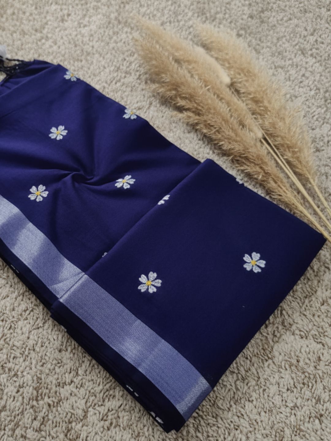 Each saree is handwoven on traditional looms using pure khadi cotton yarns. After weaving, artisans adorn the saree with machine embroidery motifs, often inspired by traditional patterns and nature. The process combines handloom authenticity with modern embroidery precision, making each piece uniquely elegant.
