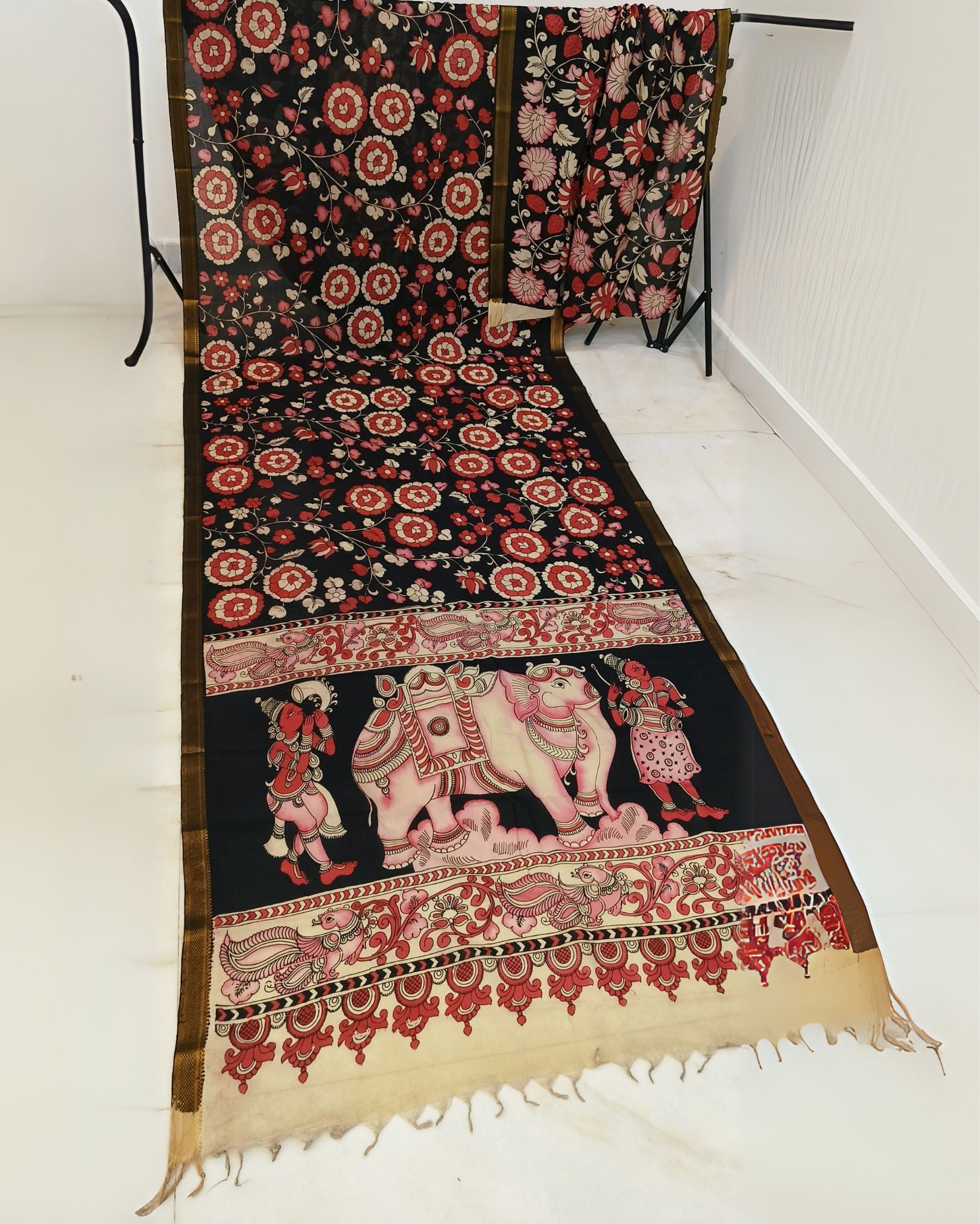 - Handpainting: Skilled artists meticulously paint floral, mythological, or abstract motifs using natural or fabric dyes.