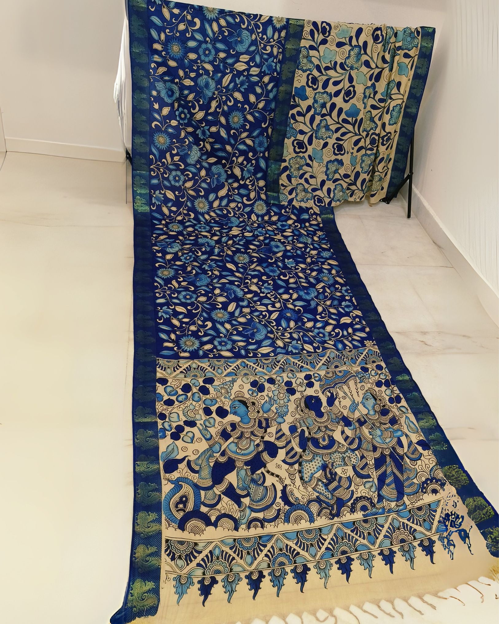 Exquisite Mangalagiri handpainted and hand-drawn sarees, showcasing intricate artistry on premium... Read more