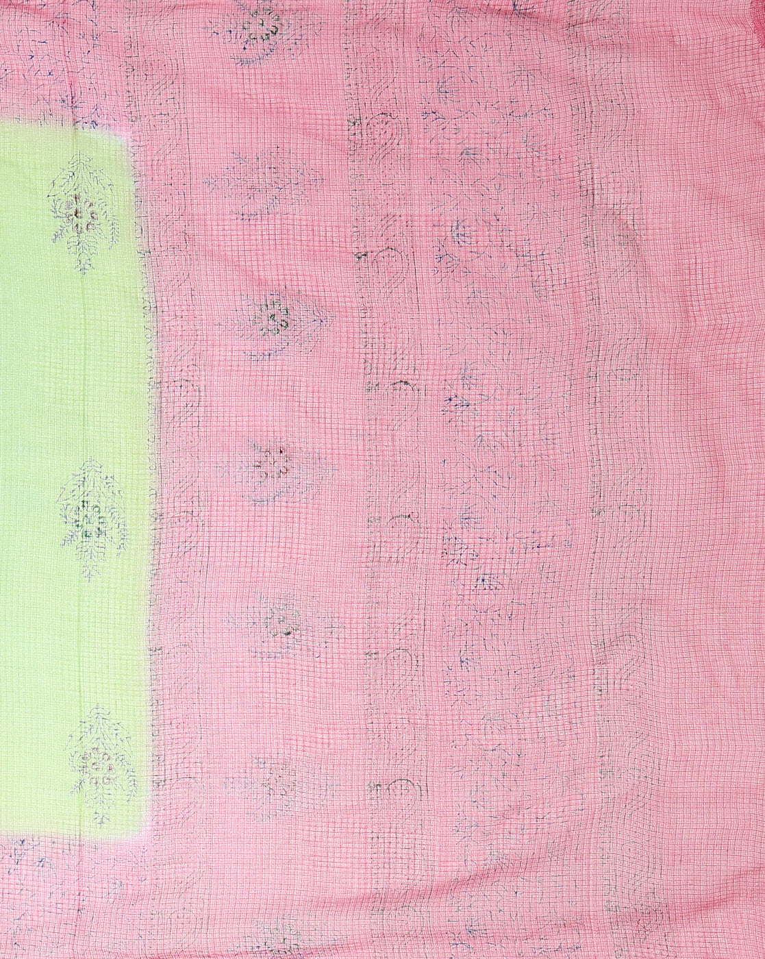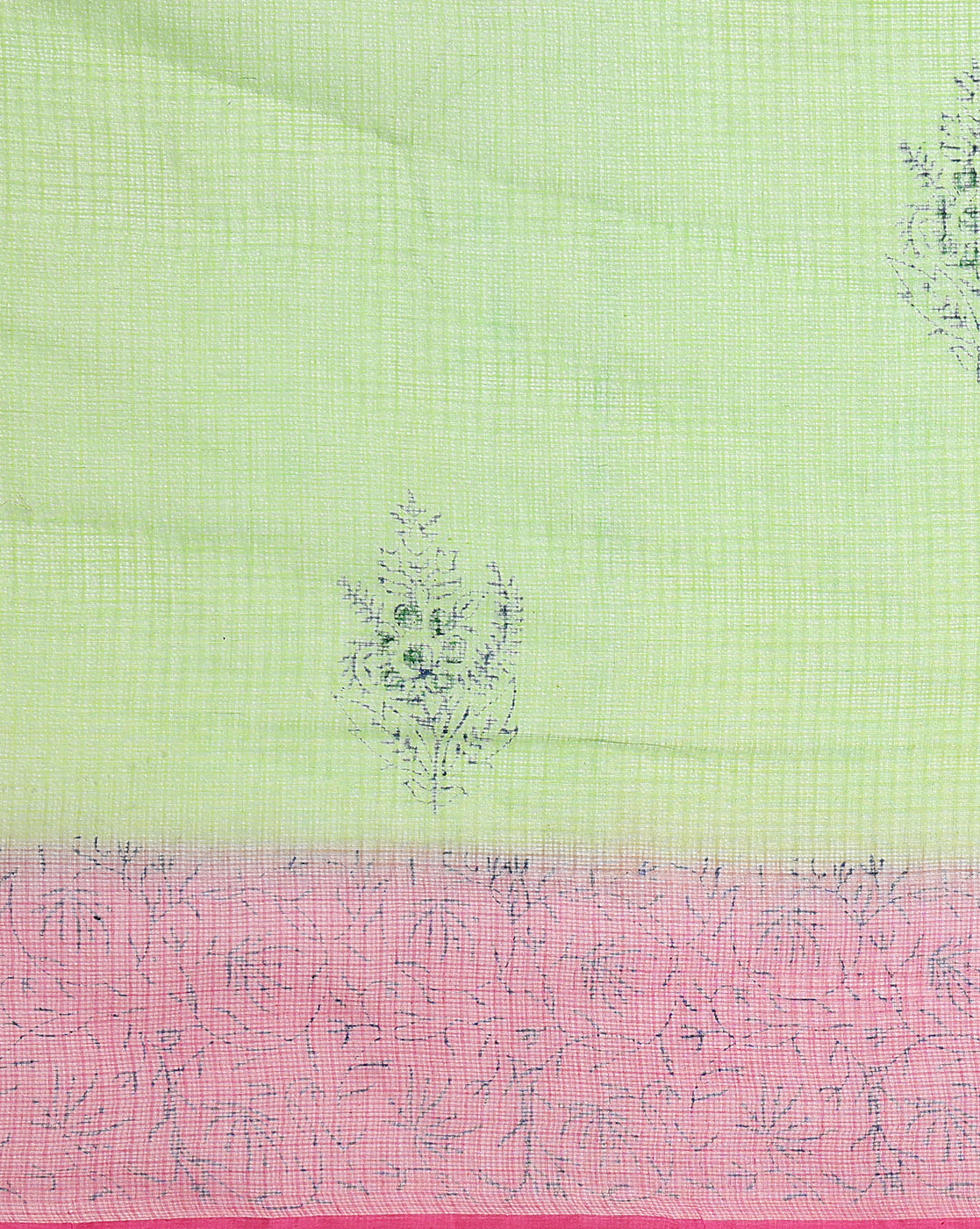 Vibrant Kota Doria Blockprinted Green & Pink Saree