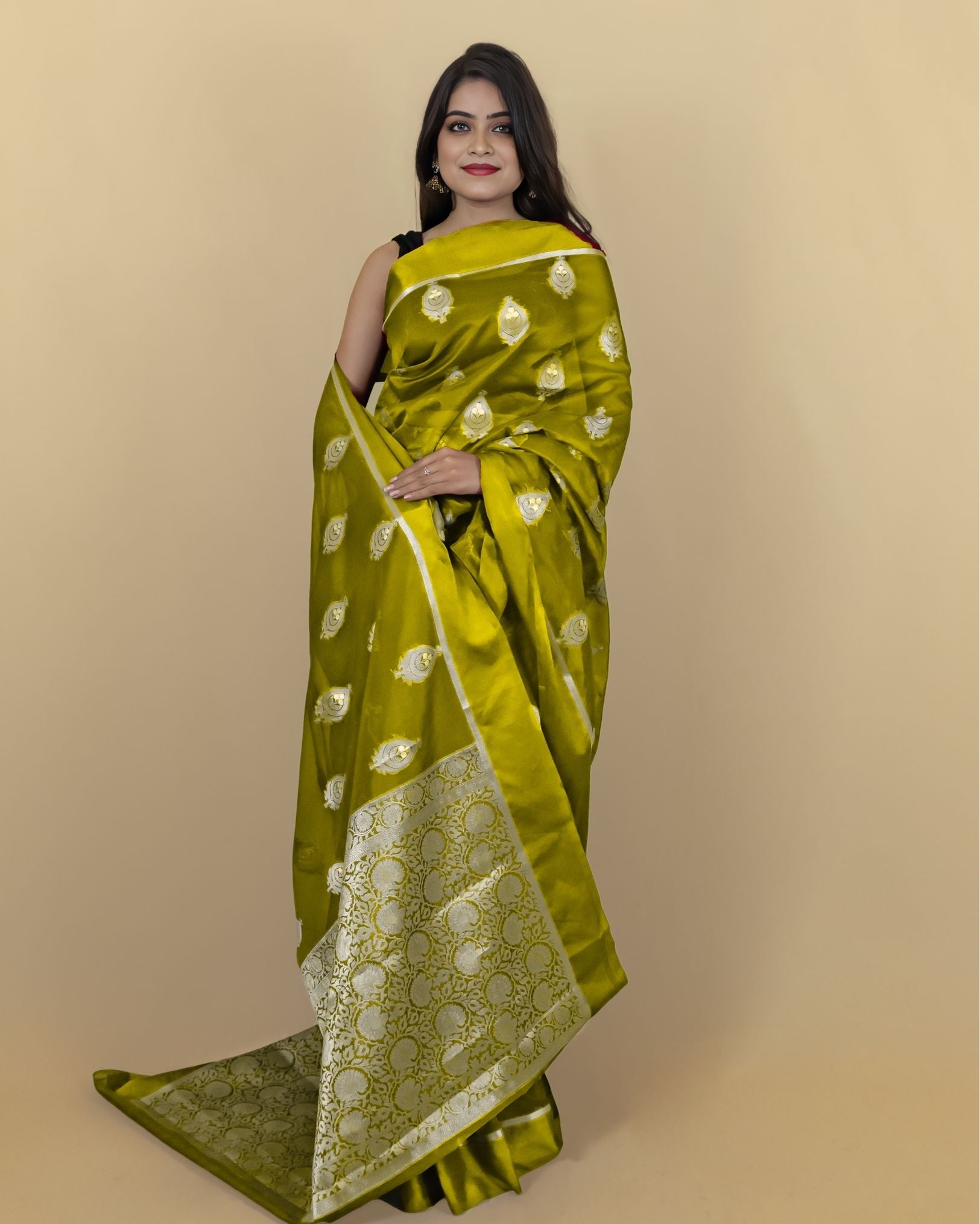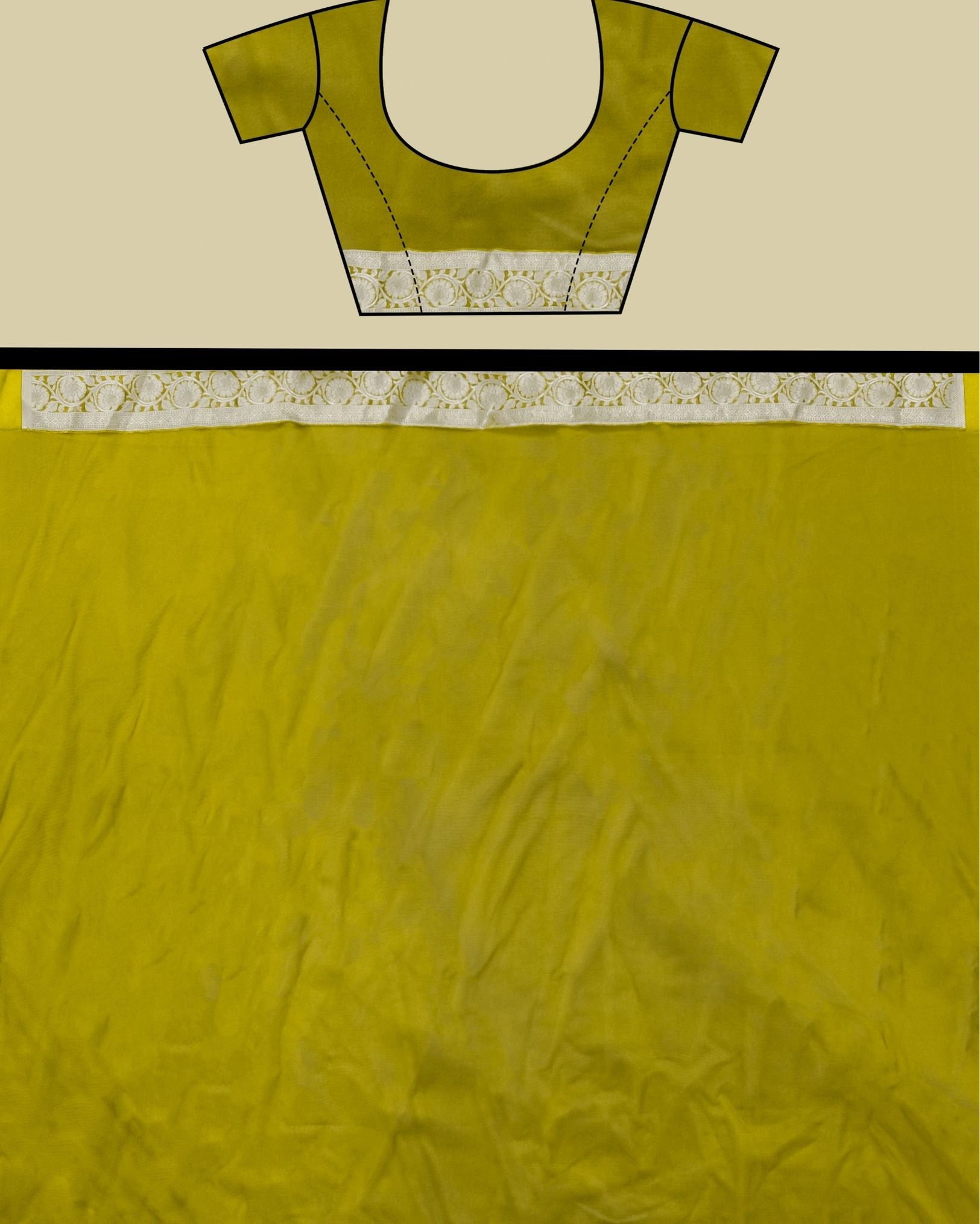 **Banarasi Organza Semi Silk** is a lightweight, sheer fabric woven using a blend of silk and synthetic fibers, adorned with traditional Banarasi motifs and zari work. It combines the crisp texture of organza with the elegance of Banarasi craftsmanship, making it perfect for festive and formal wear with a graceful, ethereal drape.