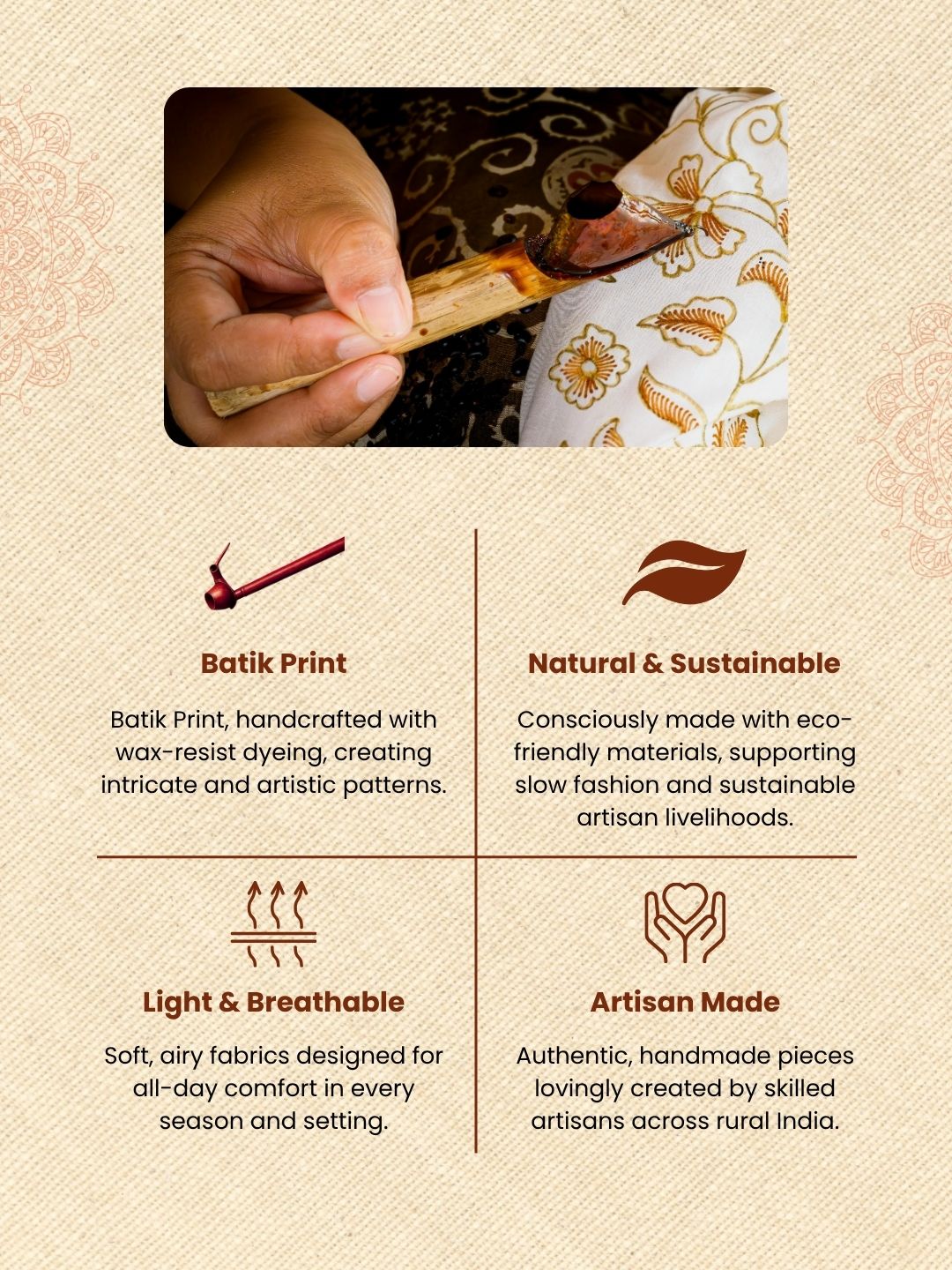 **Hand Wax Batik** is a traditional dyeing method where artisans apply hot wax to create patterns before coloring the fabric. You get rich, layered designs, soft texture, and a handmade finish that feels unique in every piece. Each section shows slight variations that reveal the artisan’s skill and process.