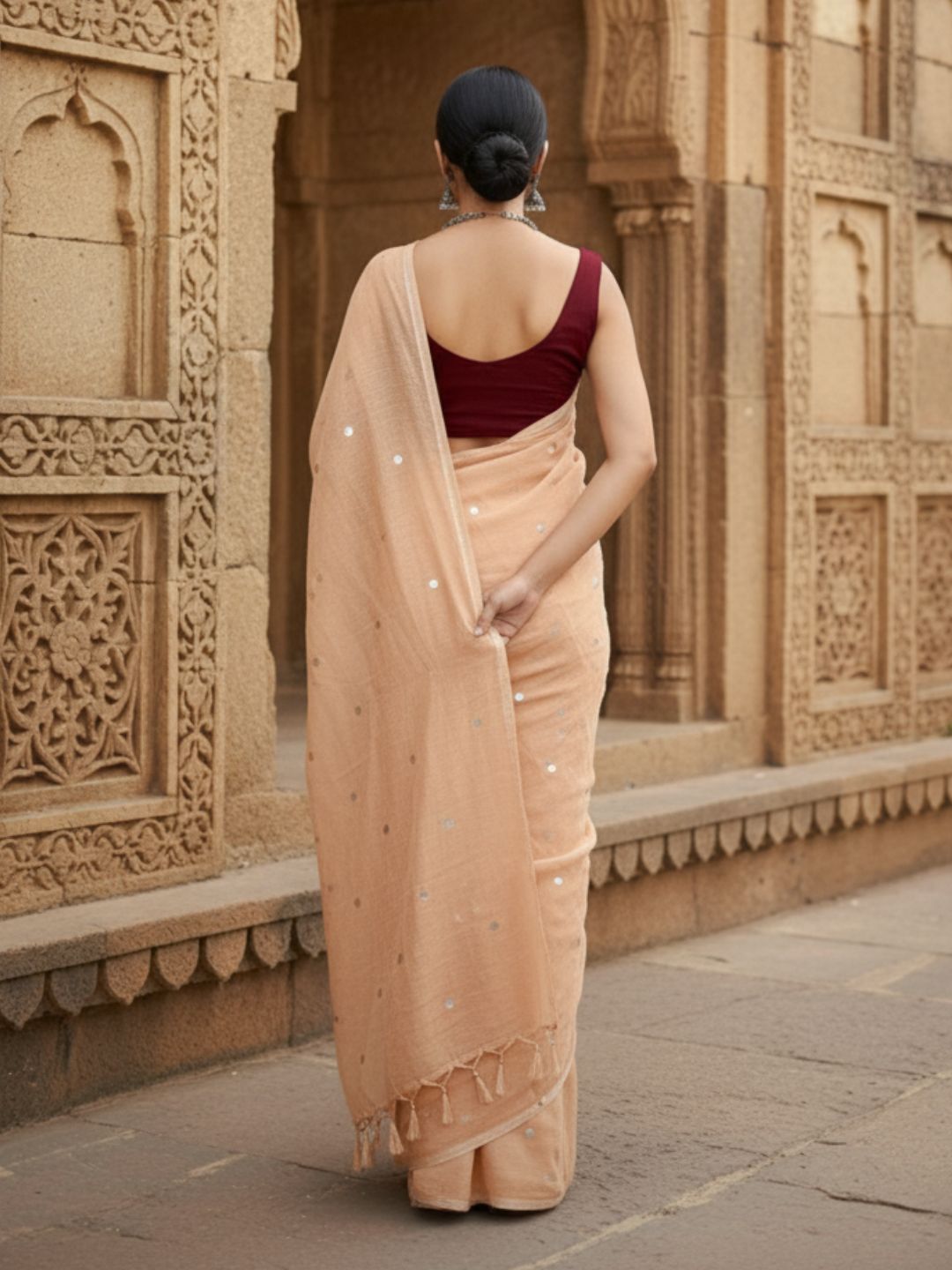 Beautiful pure mul cotton by cotton handloom saree adorned with intricate all-over gini work. Soft, airy, and lightweight - perfect for festive occasions, cultural gatherings, or everyday elegance.