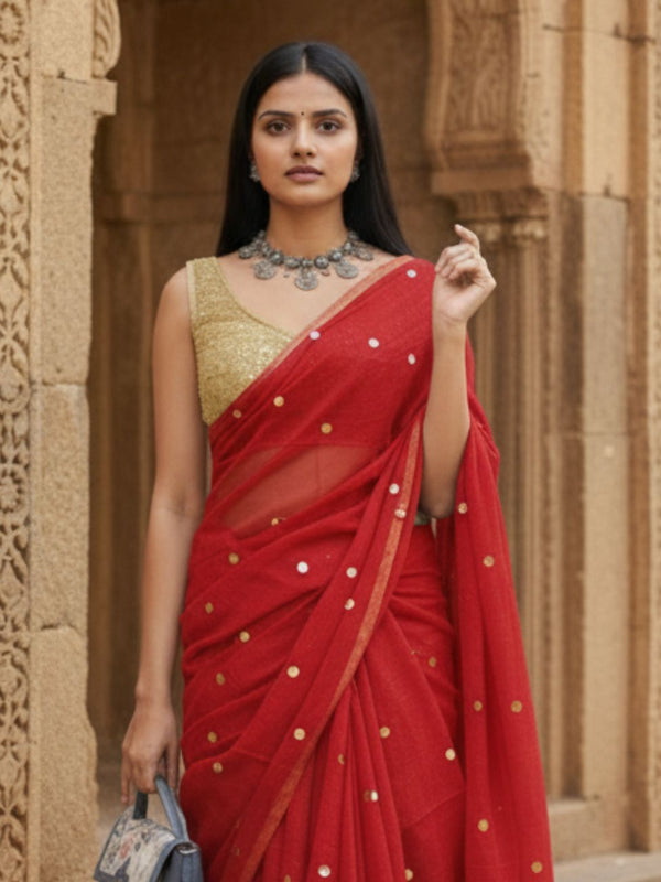 Gini Baani Pure Mul Cotton Sequin Red Saree