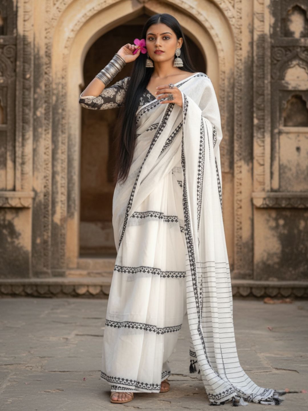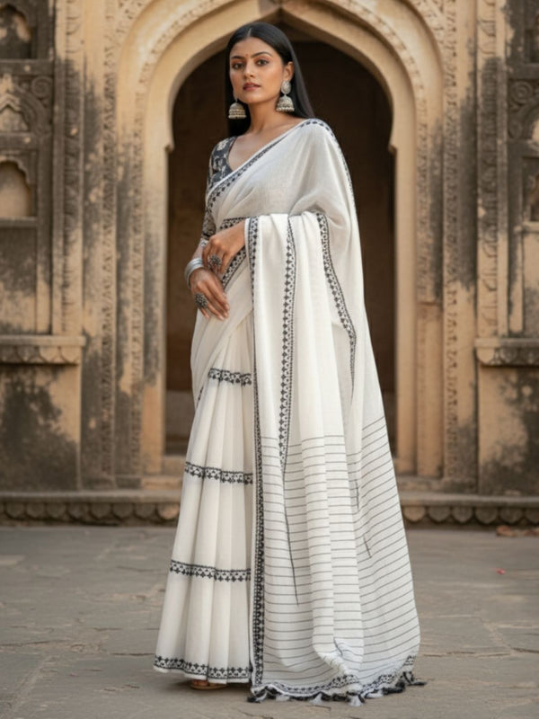 Authentic pure khadi cotton by cotton handloom saree featuring intricate weaving design work. Soft, breathable, and lightweight - perfect for festive occasions, cultural gatherings, or elegant everyday wear.