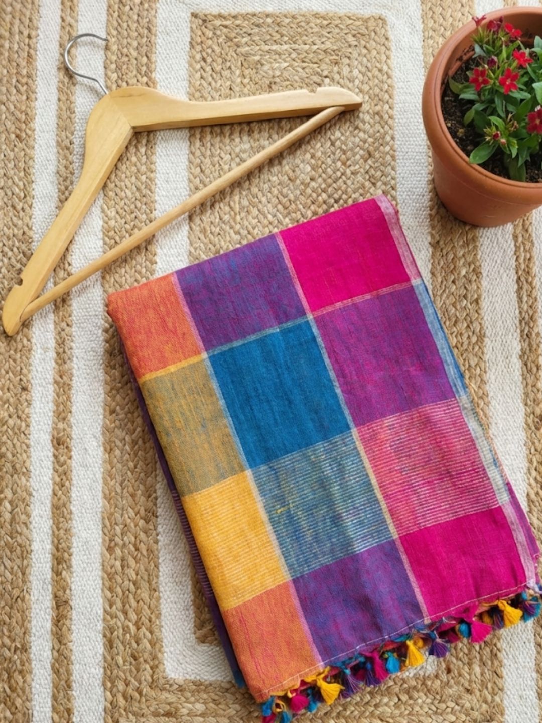 This is a handwoven linen saree made using natural fibers. It comes with a running blouse piece attached.