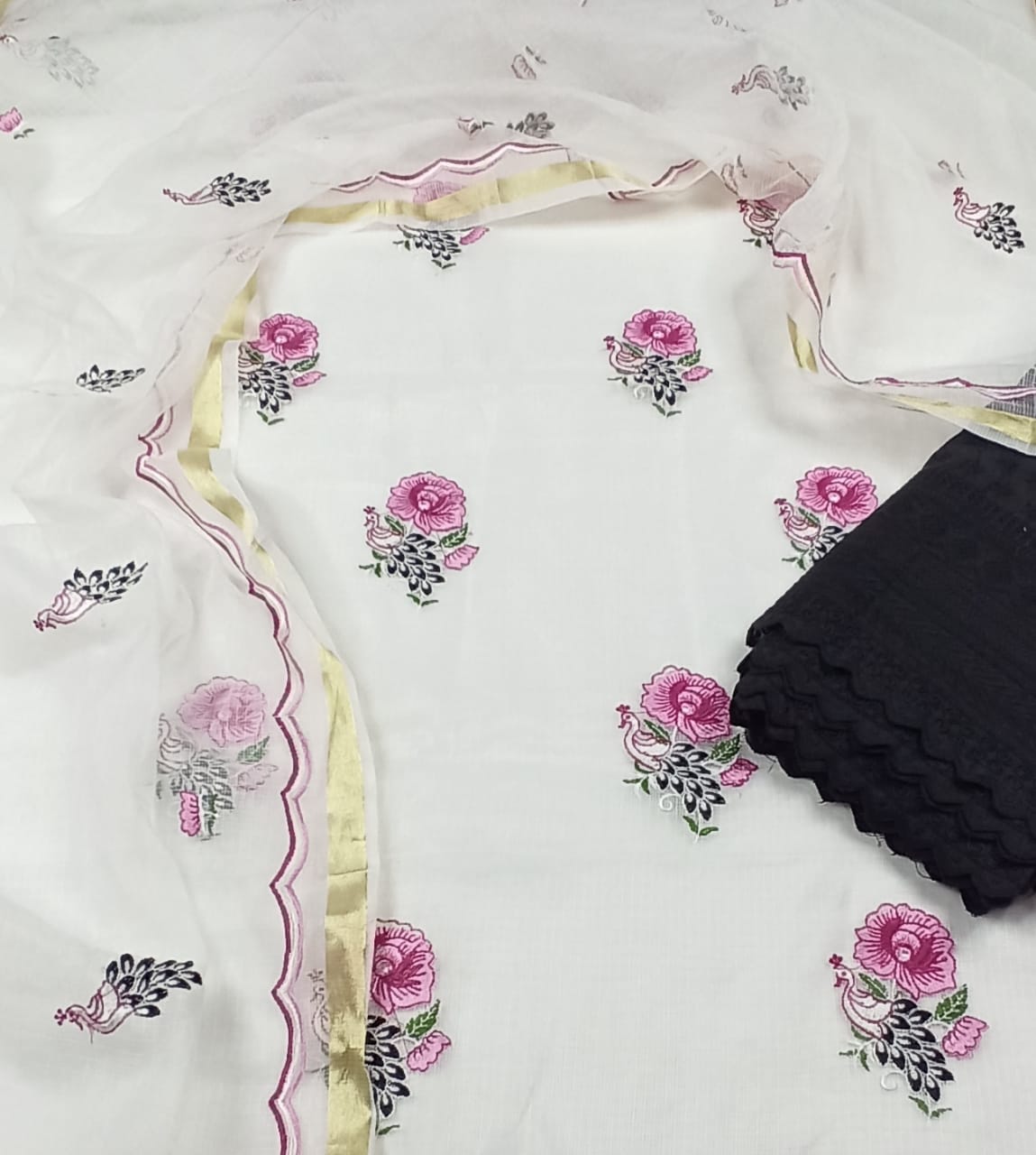 Embroidered Quaint Kota Doria White Suit (Top+Bottom+Dupatta)