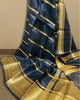 The Striped Body design features intricate Banarasi weaving with alternating stripes of different patterns, often showcasing traditional motifs like floral or geometric elements.