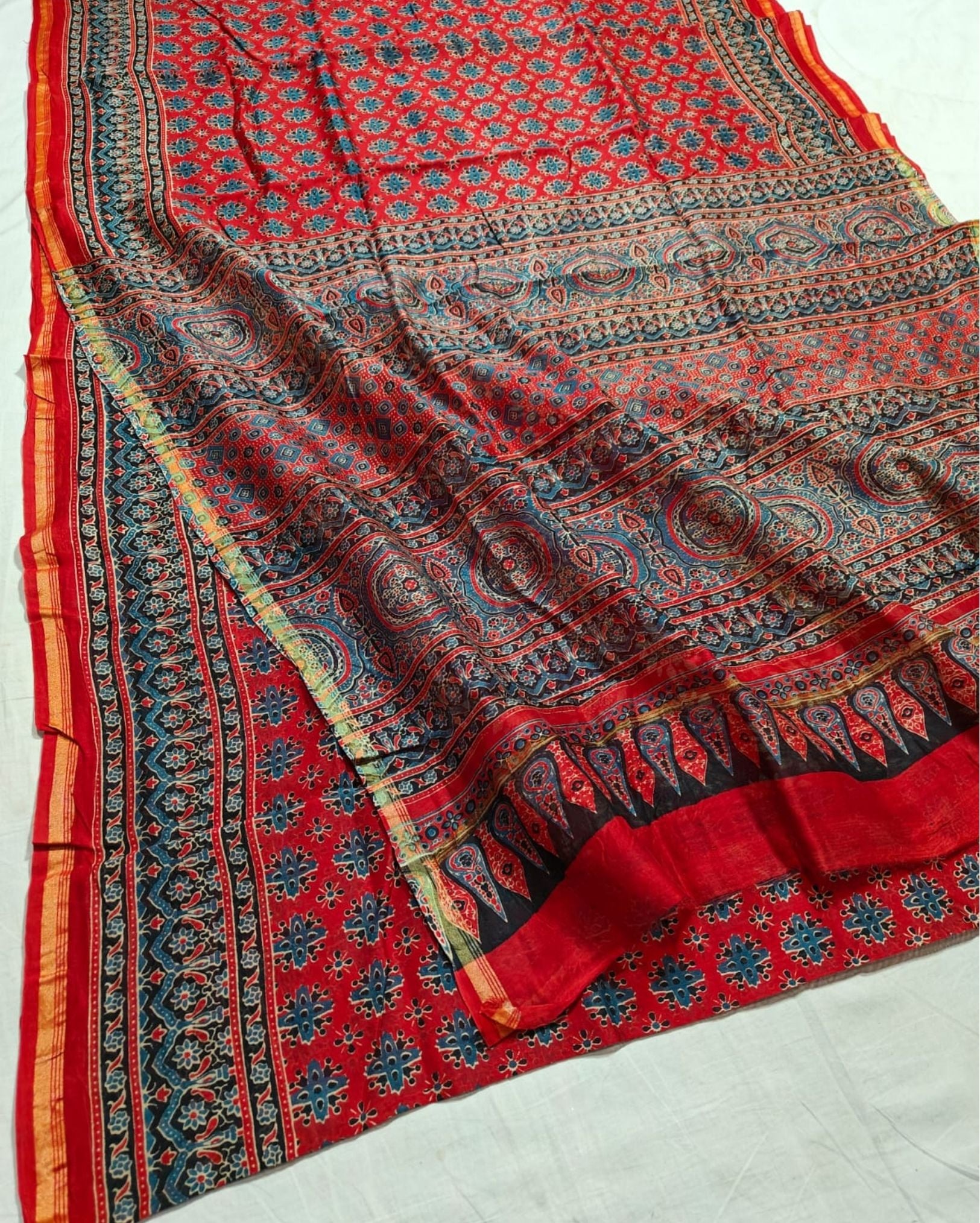 Elegant Chanderi Silk Saree featuring traditional Ajrakh Printing. Lightweight, breathable, and perfect for festive occasions or cultural events. A timeless blend of heritage craftsmanship and contemporary charm for your wardrobe.