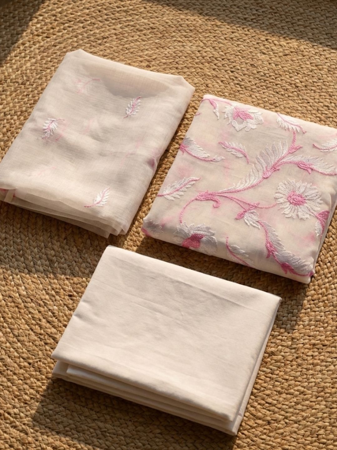 Our Kota Doria Embroidered Work Suits (top, bottom, dupatta) showcase delicate craftsmanship, featuring lightweight, airy fabric adorned with intricate Embroidered, perfect for festive occasions and graceful day-to-day wear, offering a blend of tradition and style.