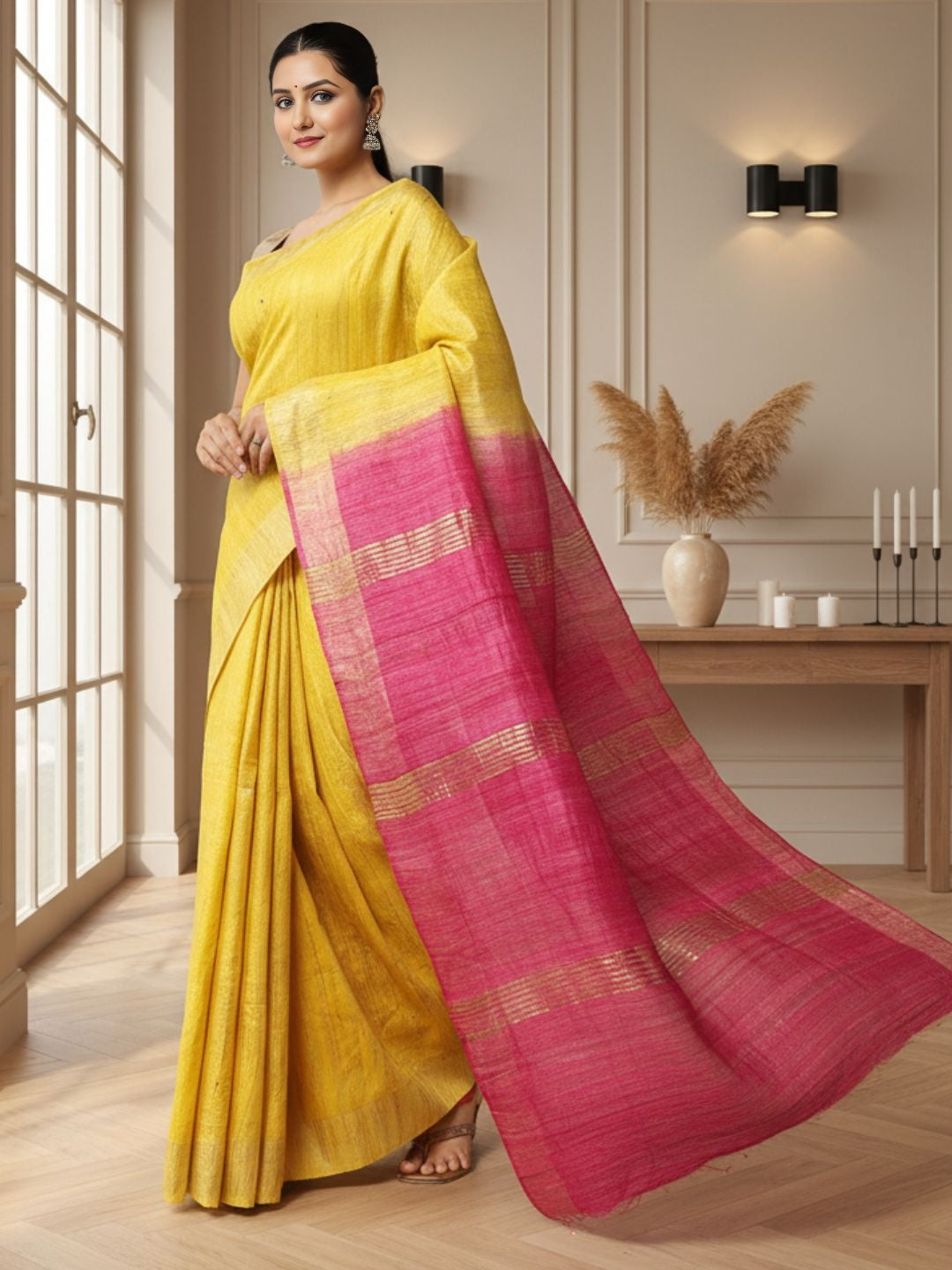 The Gichha Tussar Handloom Saree is handcrafted using traditional techniques. Each saree is unique due to the hand dyeing process, resulting in beautiful variations.