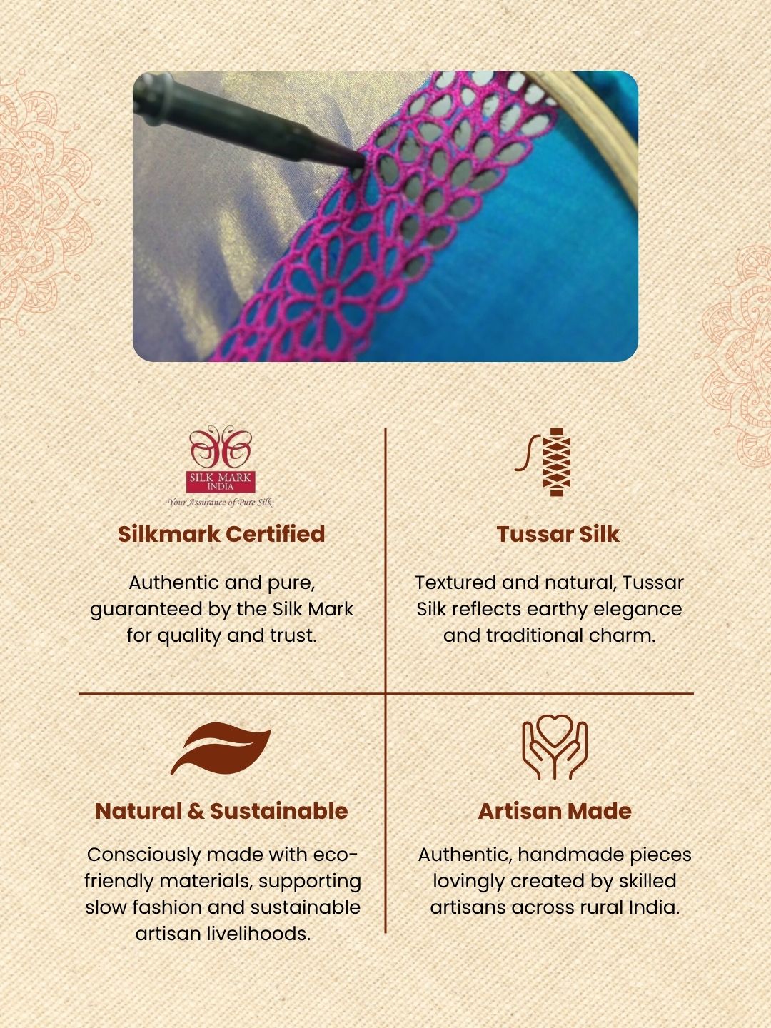 Luxurious Silkmark certified Tussar silk saree adorned with intricate heavy cutwork. Perfect for weddings and festive occasions, this elegant saree blends traditional craftsmanship with rich, timeless sophistication and graceful charm.