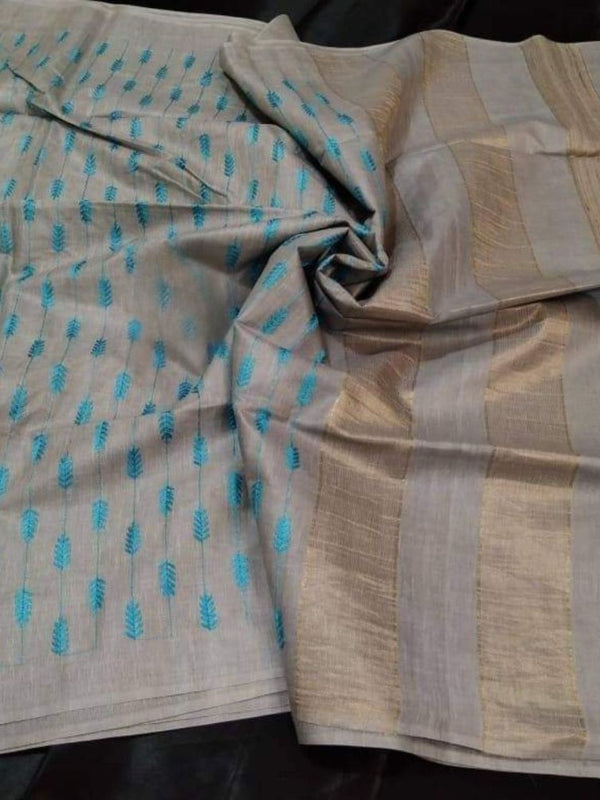 - The saree is embellished with intricate embroidery work, showcasing exquisite craftsmanship and attention to detail. The embroidery may include traditional motifs, floral patterns, or other decorative elements, adding charm and sophistication to the saree.