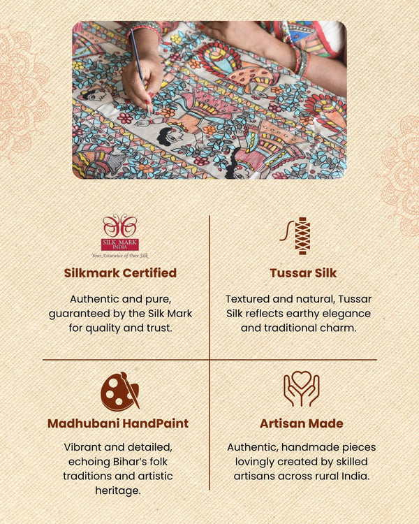Silkmark Tussar Vivid Madhubani Handpainted Red Saree