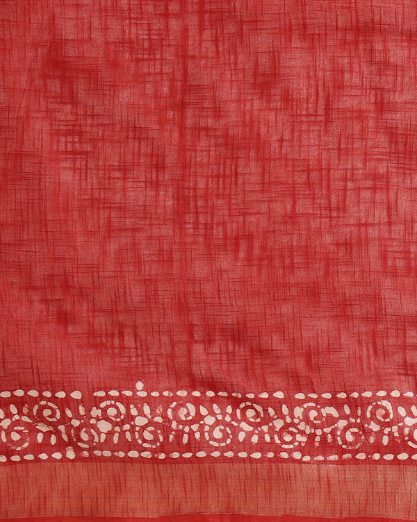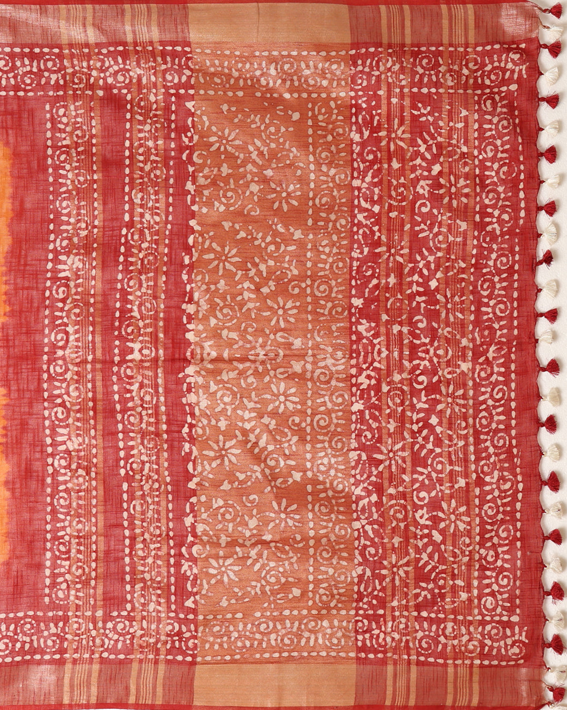A Slub Linen Saree Batik Print saree is crafted from slub linen fabric featuring traditional batik printing techniques. Slub linen has a textured appearance due to irregularities in the yarn, adding character to the fabric.