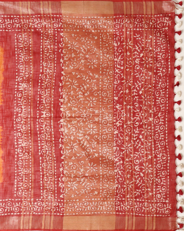 Bold Mustard Maroon Wax Batik Hand Dyed Slub Linen Saree