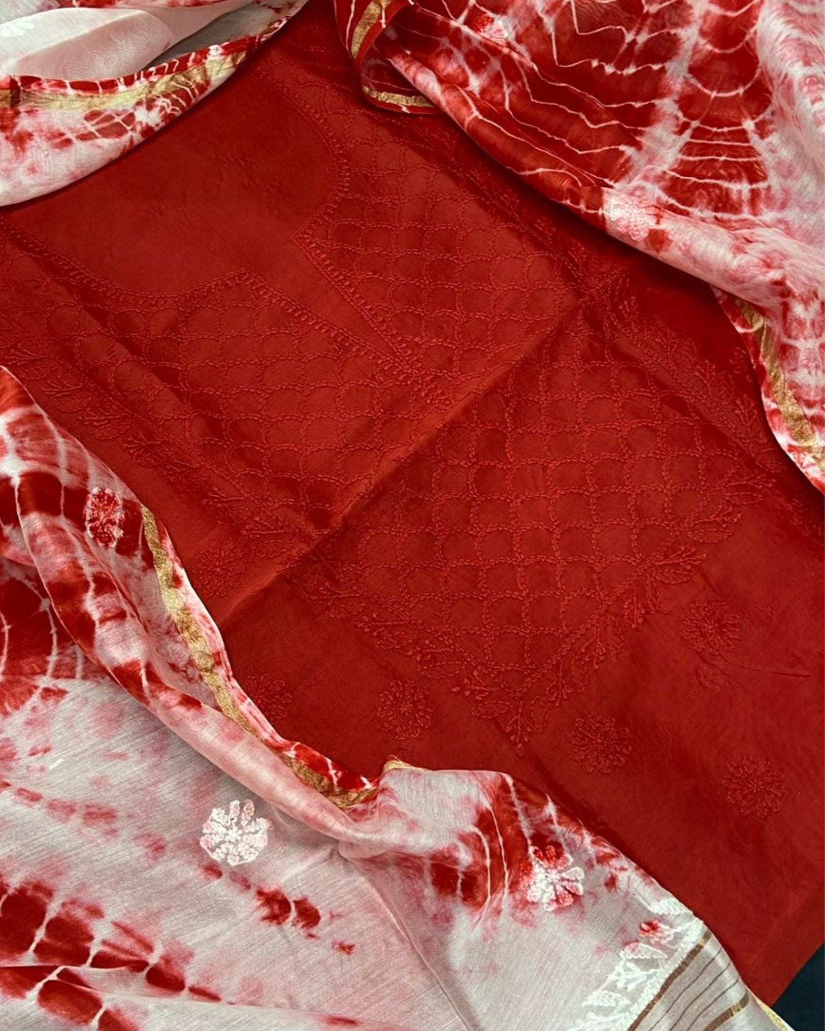Chikankari Pure Chanderi Silk Kinetic Red Kurta & Dupatta