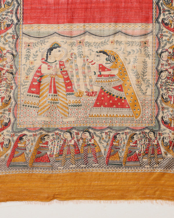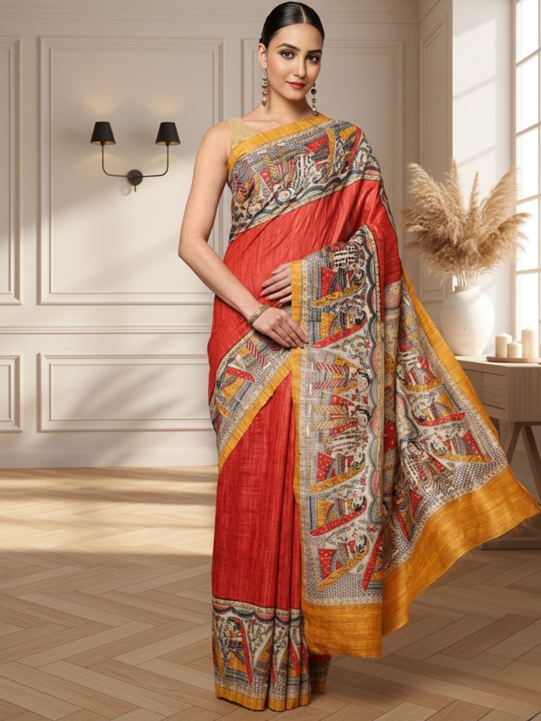 Silkmark Tussar Quaint Madhubani Red & Beige Saree