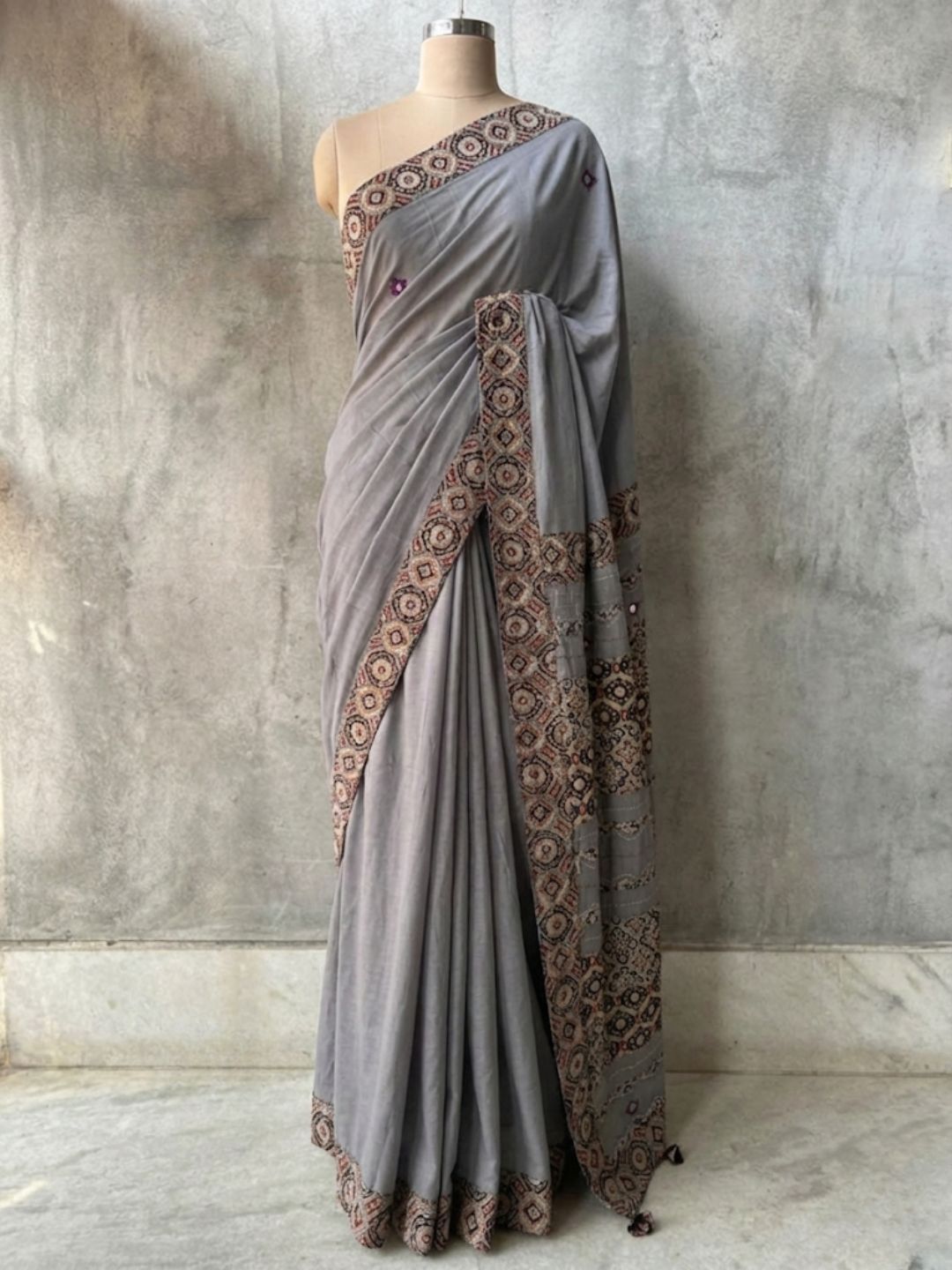Pure mul cotton saree featuring Ajrakh patchwork with mirror work detailing. Soft, airy, and ligh... Read more
