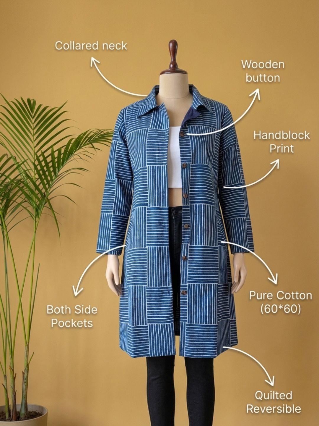 A Pure Cotton Hand Block Print Jacket is a handcrafted outerwear piece made from pure cotton fabric. Artisans decorate the fabric using traditional hand block printing. You can layer it over kurtas, dresses, tops, or sarees.