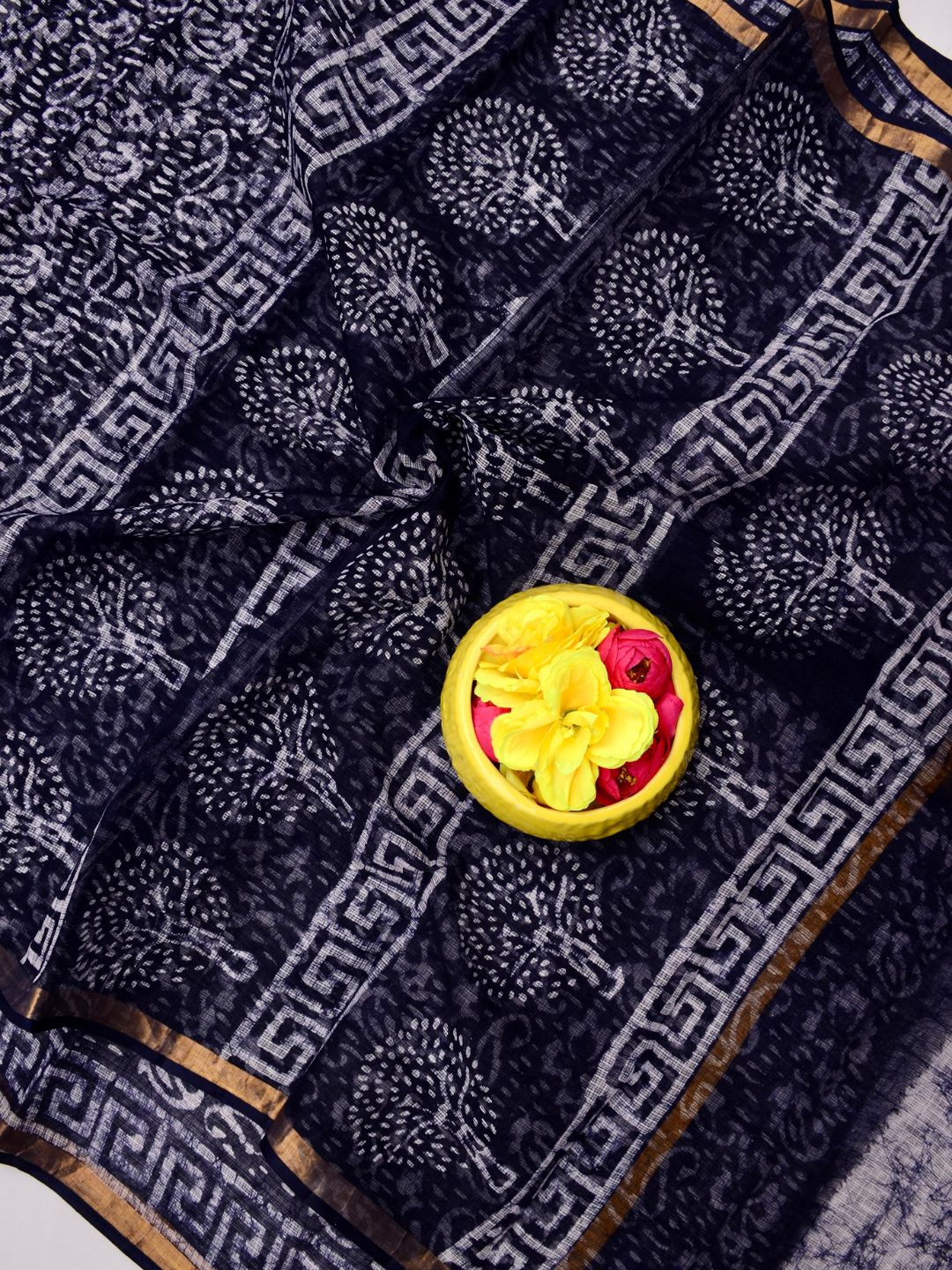 Ajrakh Printed Arapawa Blue Chanderi Silk Saree