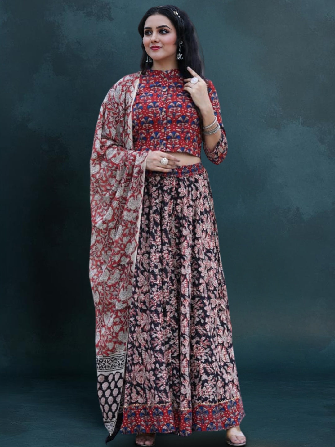 A stunning hand block print cotton lehenga choli, crafted with intricate patterns and vibrant hues. This breathable and elegant ensemble blends traditional artistry with modern charm, perfect for festive occasions and celebrations.