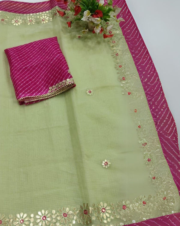 - The saree is made from high-quality Kota cotton, which is woven on traditional handlooms to achieve its characteristic lightweight and slightly stiff texture. The Gota Patti embellishments are meticulously handcrafted by skilled artisans who cut, shape, and stitch the metallic ribbons onto the fabric, creating intricate designs.