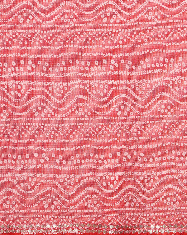 - The saree is made from high-quality Kota cotton, which is woven on traditional handlooms to achieve its characteristic lightweight and slightly stiff texture. The Gota Patti embellishments are meticulously handcrafted by skilled artisans who cut, shape, and stitch the metallic ribbons onto the fabric, creating intricate designs.