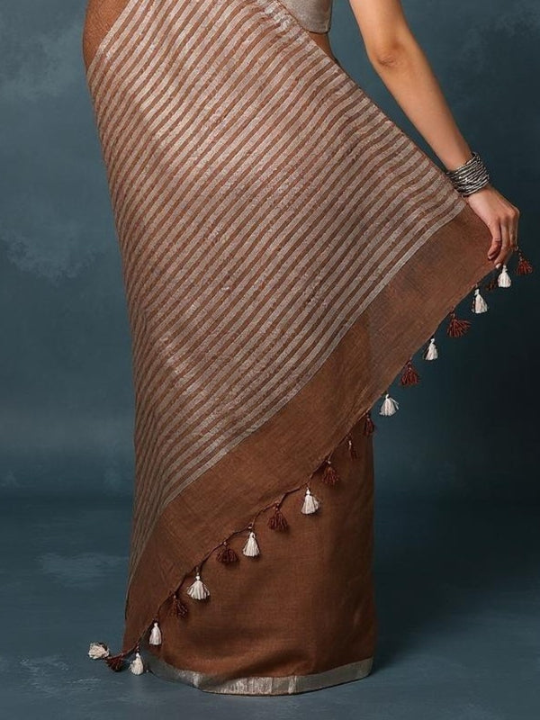 1. What is a Pure Linen Embroidered Handloom Saree with Zari Border and Striped Pallu?