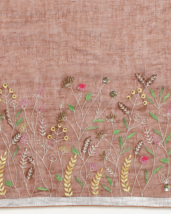 Gulmohar Pure Linen Hand Embroidered Saree Deep Brown