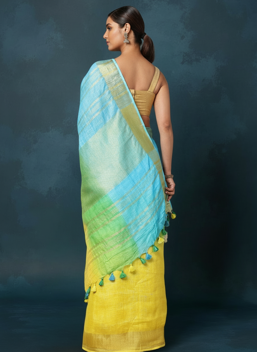Elegant Pure Linen Hand Ombre Dyed Saree, featuring soft breathable fabric with graceful color gradients. A perfect blend of comfort and style, ideal for festive occasions, casual wear, and timeless sophistication.